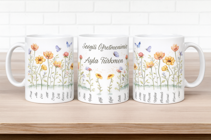 Öğretmene Özel Çiçekli Sevgili Öğretmenim Baskılı Kupa Bardak - Öğrenci İsimli