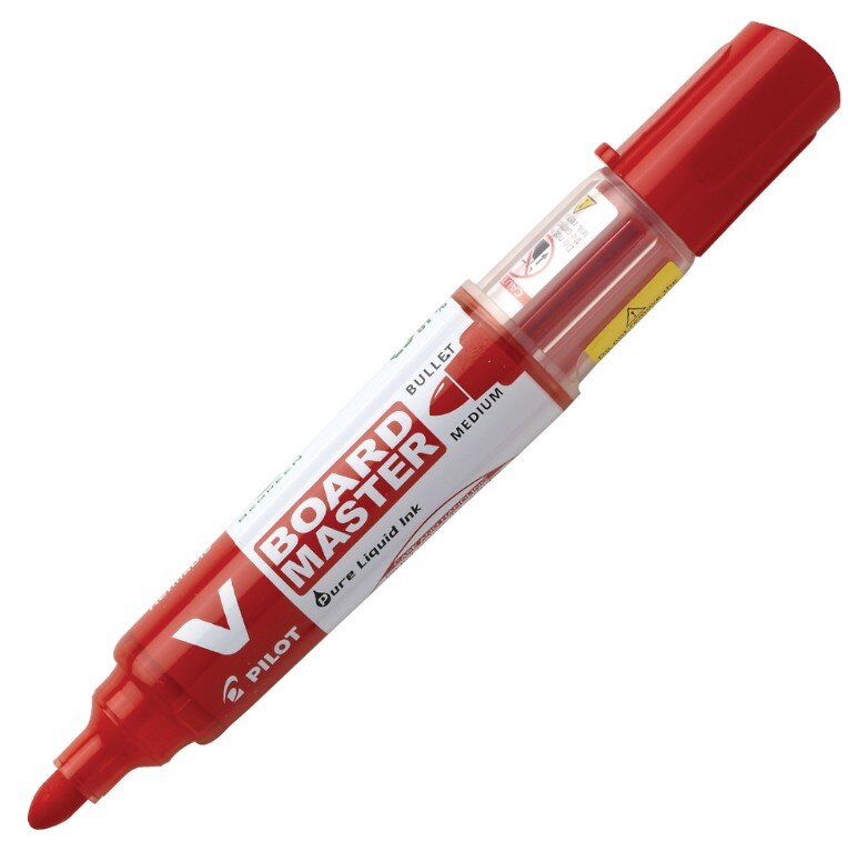 Pilot's V BOARD MASTER, %91 geri dönüştürülmüş plastikten üretilmiş yüksek kaliteli, yuvarlak uçlu bir kalemdir. Özellikleri arasında, her türlü beyaz tahta yüzeyinden bir bezle kolayca silinebilen canlı renkli, akıcı sıvı mürekkep bulunur. Benzersiz çift borulu besleme sistemi, son damlasına kadar olağanüstü performans sunar. Ksilen veya benzeri çözücüler içermediği için yeniden doldurulabilir, yani bir V BOARD MASTER diğer kalemlerden çok daha uzun süre kullanılabilir. V BOARD MASTER ayrıca kokusuzdur ve 5 renkte (siyah, mavi, kırmızı, yeşil ve turuncu) mevcuttur.