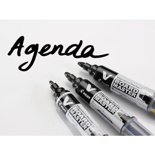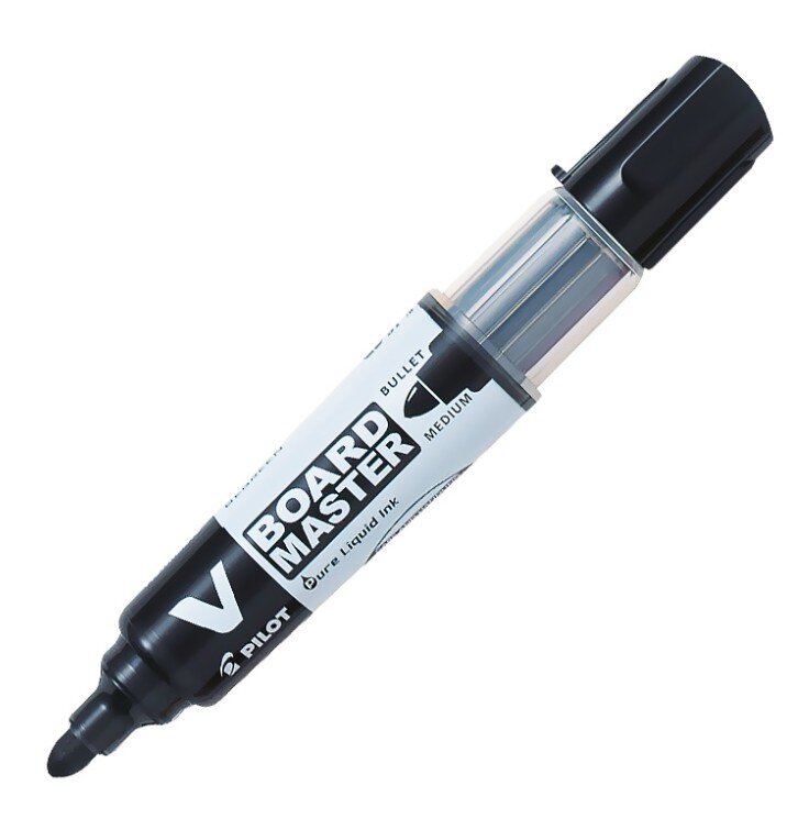 Pilots V BOARD MASTER, %91 geri dönüştürülmüş plastikten üretilmiş yüksek kaliteli, yuvarlak uçlu bir kalemdir. Özellikleri arasında, her türlü beyaz tahta yüzeyinden bir bezle kolayca silinebilen canlı renkli, akıcı sıvı mürekkep bulunur. Benzersiz çift borulu besleme sistemi, son damlasına kadar olağanüstü performans sunar. Ksilen veya benzeri çözücüler içermediği için yeniden doldurulabilir, yani bir V BOARD MASTER diğer kalemlerden çok daha uzun süre kullanılabilir. V BOARD MASTER ayrıca kokusuzdur ve 5 renkte (siyah, mavi, kırmızı, yeşil ve turuncu) mevcuttur.