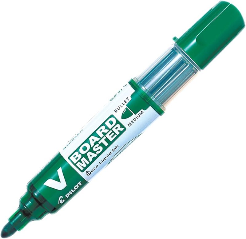 Pilot's V BOARD MASTER, %91 geri dönüştürülmüş plastikten üretilmiş yüksek kaliteli, yuvarlak uçlu bir kalemdir. Özellikleri arasında, her türlü beyaz tahta yüzeyinden bir bezle kolayca silinebilen canlı renkli, akıcı sıvı mürekkep bulunur. Benzersiz çift borulu besleme sistemi, son damlasına kadar olağanüstü performans sunar. Ksilen veya benzeri çözücüler içermediği için yeniden doldurulabilir, yani bir V BOARD MASTER diğer kalemlerden çok daha uzun süre kullanılabilir. V BOARD MASTER ayrıca kokusuzdur ve 5 renkte (siyah, mavi, kırmızı, yeşil ve turuncu) mevcuttur.